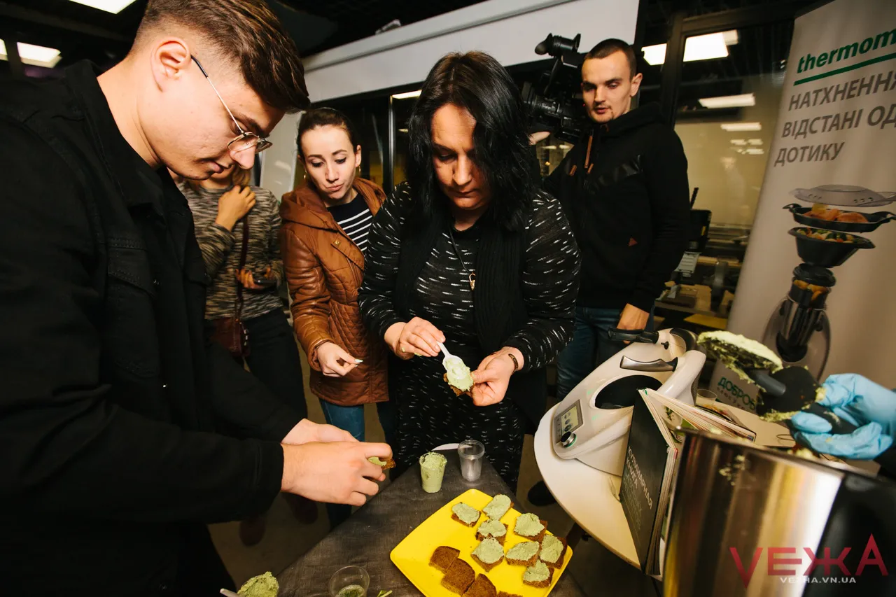 Та оскільки головним продуктом вечора була черемша (або дикий часник, як її назвала Олена Павлова) з неї приготували одразу дві страви: песто, яке презентували кілька днів тому на міжнародній туристичній виставці у Києві, а також вершковий суп-пюре.