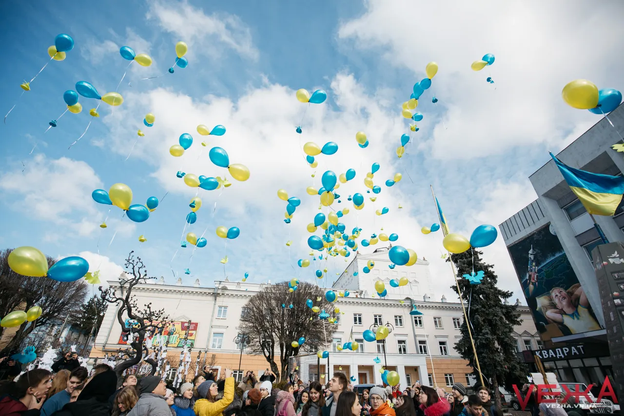 Але на цьому акція не закінчилася: за кілька хвилин на площу винесли кілька десятків жовтих і блакитних повітряних кульок, до яких на срібних стрічках були прикріплені жовті і блакитні ангелочки, як символ душ полеглих.