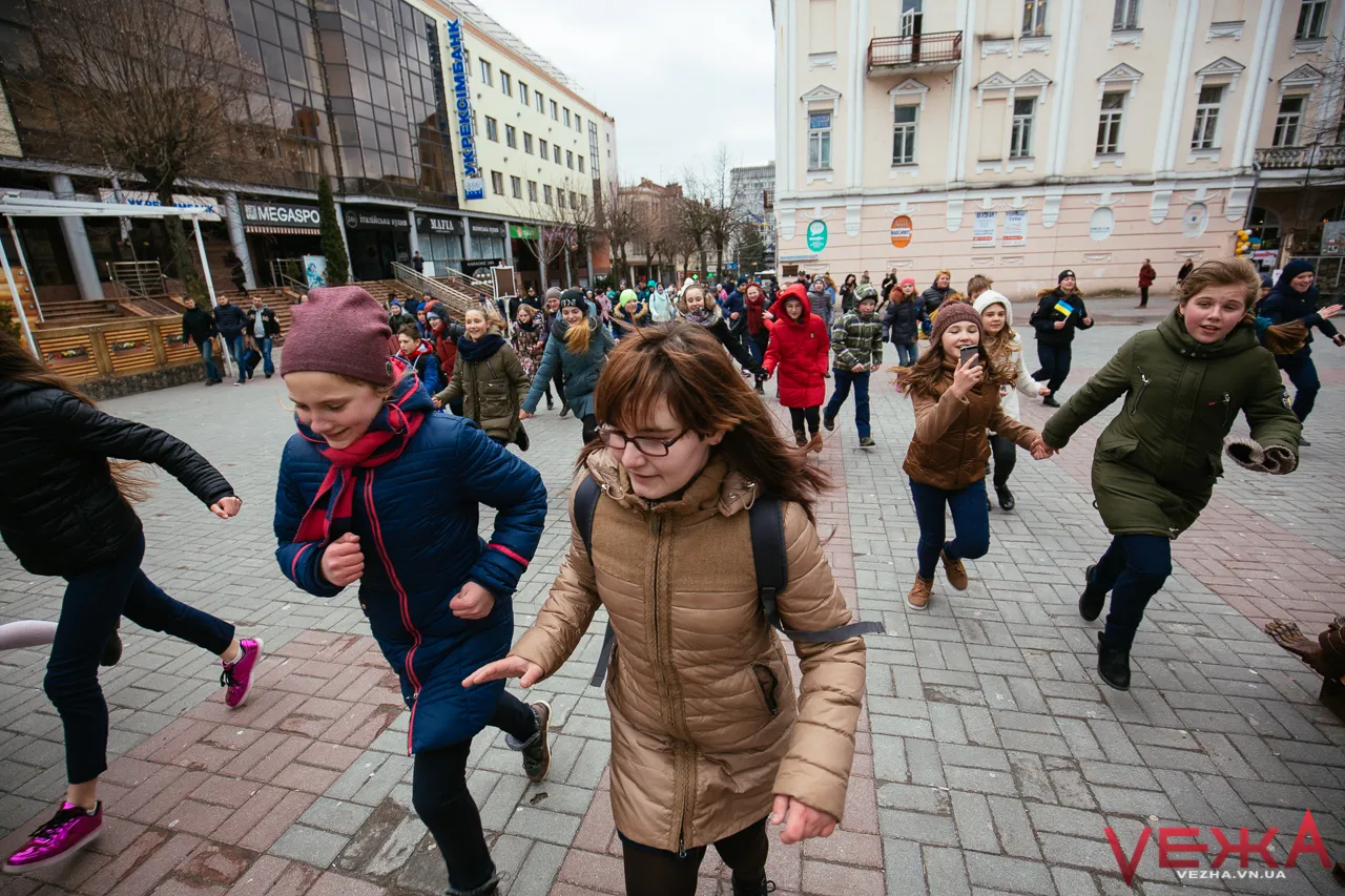 Тут, біля Вежі Артинова, вони вишикувалися у формі серця, усі обійнялися та почали синхронно присідати. У цей момент на площі з’явився дуже комунікабельний пес породи хаскі, який бігяв по периметру “серця”, лащився до дітвори, а ті навперебій обіймали хвостатого.