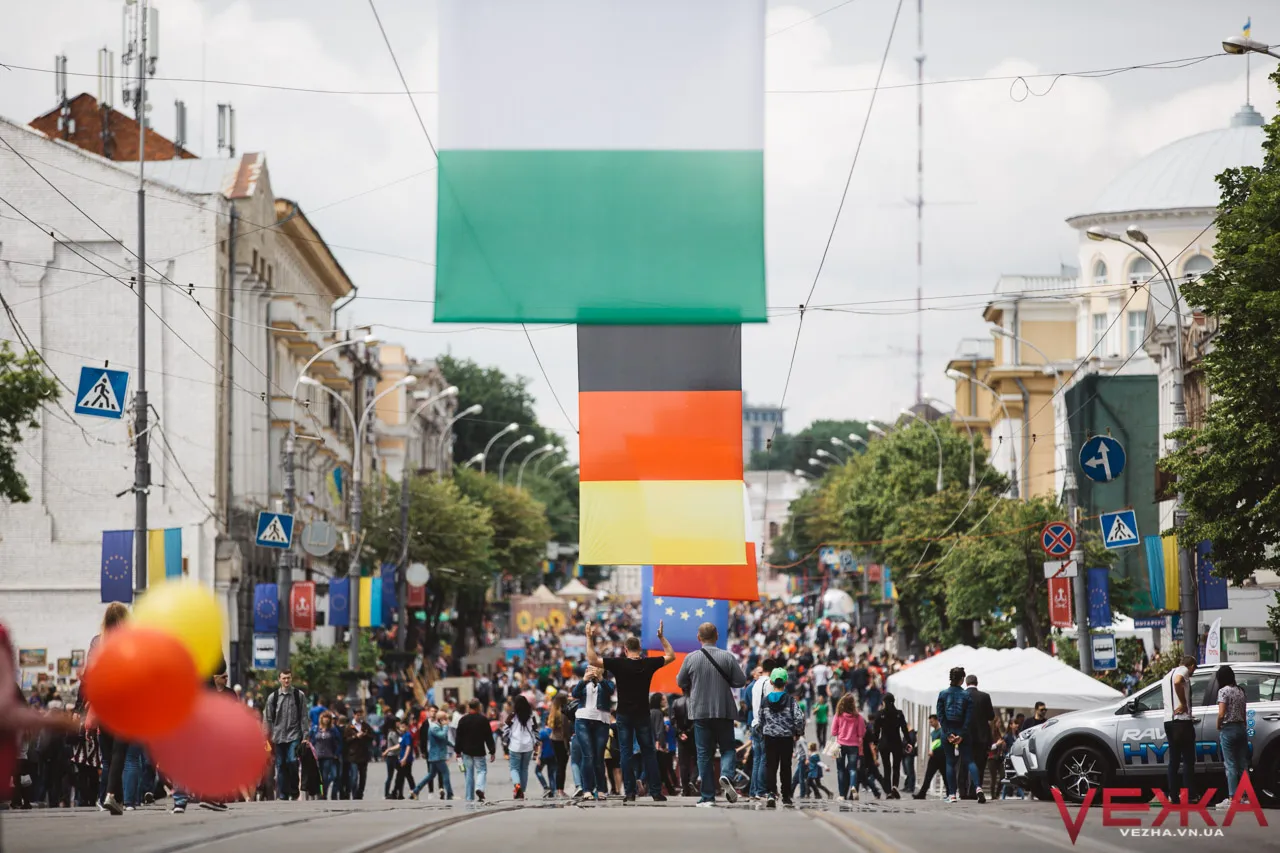 Основні події вже розгортаються на вулиці Соборній та Майдані Незалежності: центральна вулиця перекрита для руху транспорту, тут розташувалося багато тематичних фотозон та просторових інсталяцій. Упродовж усієї вулиці над головами вінничан розвішені величезні прапори країн Євросоюзу.