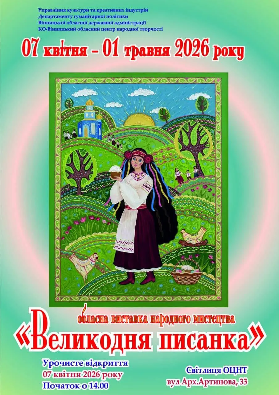 У Вінницькому обласному центрі народної творчості відкрилася виставка «Великодня писанка». Відвідувачі можуть побачити як традиційні писанки, так і живописні картини та інші твори різних видів народного мистецтва, що стосуються тематики Великодня.