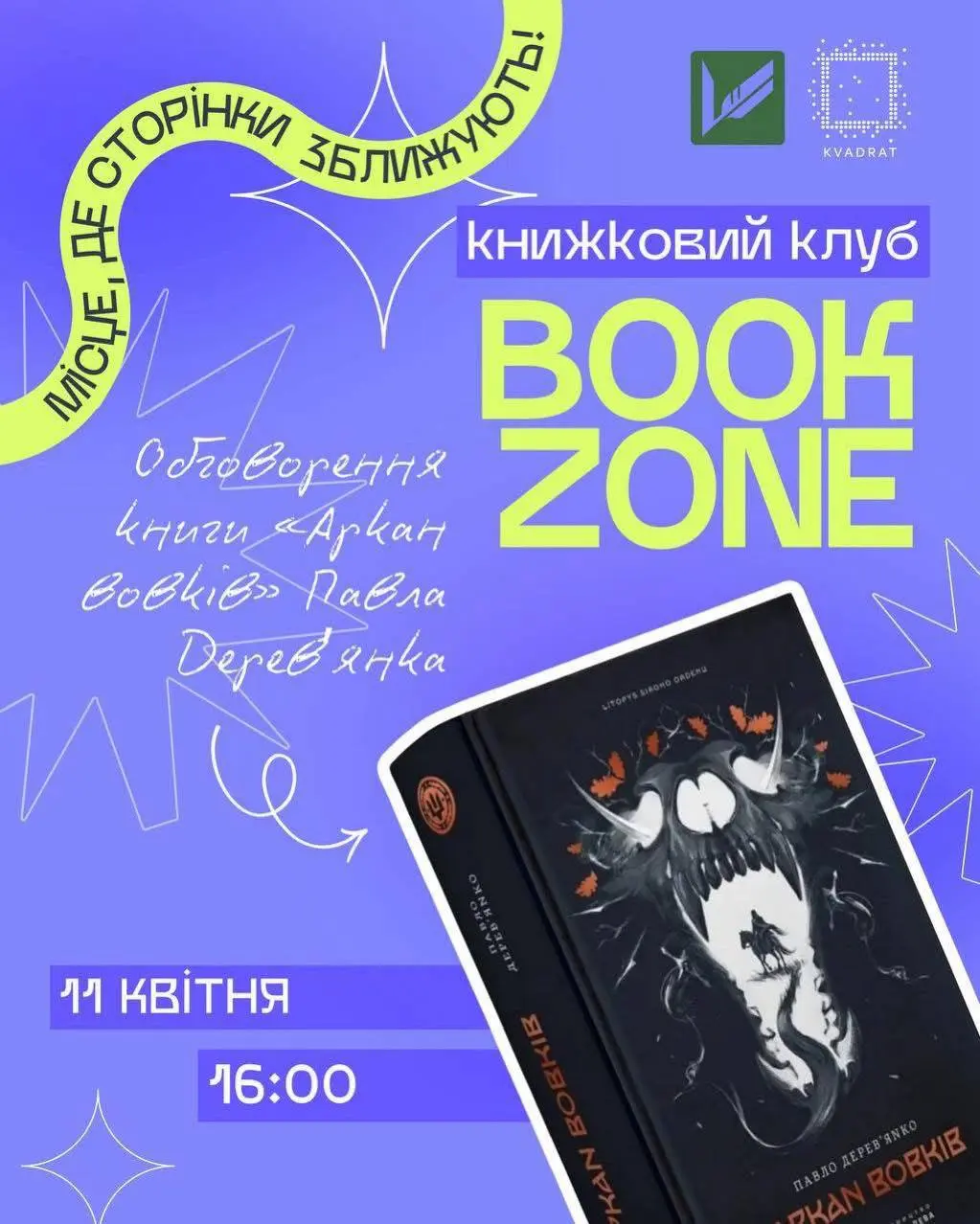 У Вінницькому обласному молодіжному центрі «Квадрат» обговорюватимуть книгу «Аркан вовків». Організатори наголошують, що це буде не просто розмова, а справжнє занурення: учасники розберуть тему «свій – чужий», внутрішні конфлікти та вибір, а також обговорять атмосферу, символіку та фінал, який залишає післясмак.