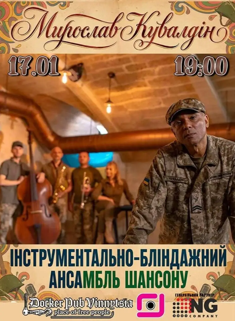 У Docker pub Vinnytsia виступить музичний колектив ІБАШ (“Інструментально-Бліндажний Ансамбль Шансону”) під керівництвом Мирослава Кувалдіна. Вони представлять свій дебютний альбом «Чікі-Бум» для вінничан.