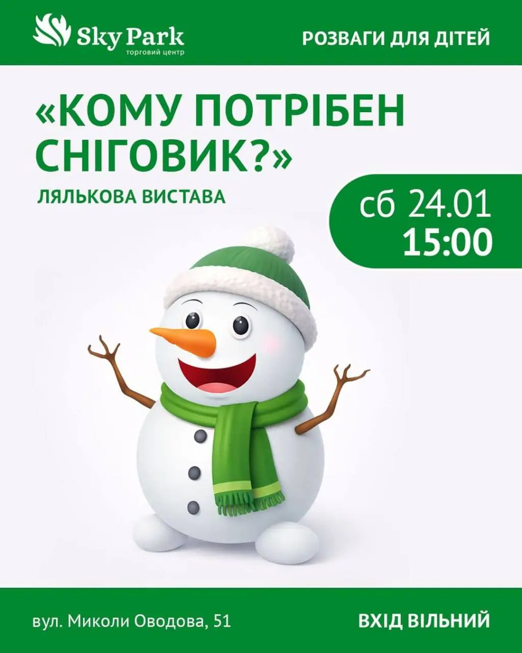 У ТРЦ Sky Park відбудеться лялькова вистава для дітей «Кому потрібен Сніговик». За словами організаторів, це тепла зимова історія, яка здатна подарувати позитивні емоції не лише дітям, а й усій родині.