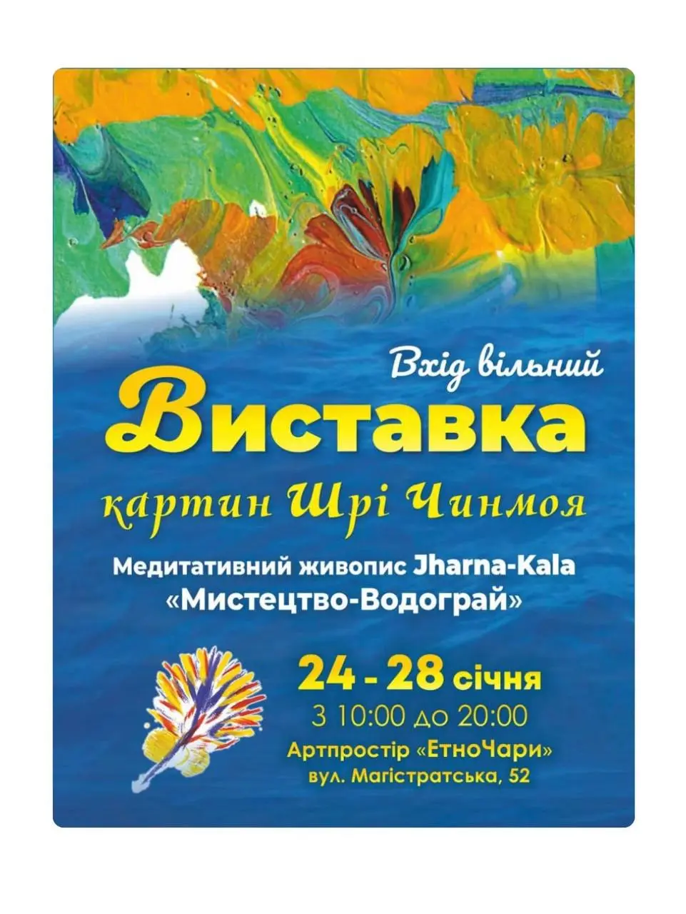 В артпросторі «ЕтноЧари» відкриється виставка картин Шрі Чинмоя. За словами організаторів, експозиція покликана створити сонячну атмосферу. Відвідувачі також зможуть поспілкуватися, послухати музику у виконанні «Jatrimusic» та «Asha Nadi», а також познайомитись з технікою медитативного малювання.