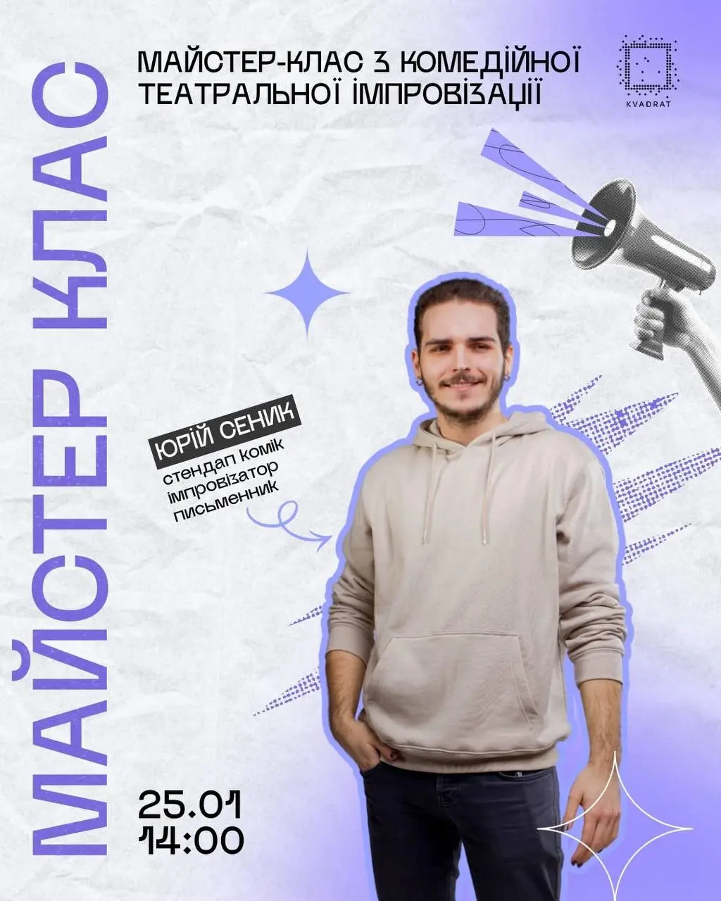 У Вінницькому обласному молодіжному центрі «Квадрат» відбудеться майстер-клас із комедійної театральної імпровізації. Захід проведе Юрій Сеник – стендап-комік, письменник та імпровізатор. Подія буде корисною для тих, хто прагне покращити творчі навички, впевненість у собі та комунікацію з людьми.