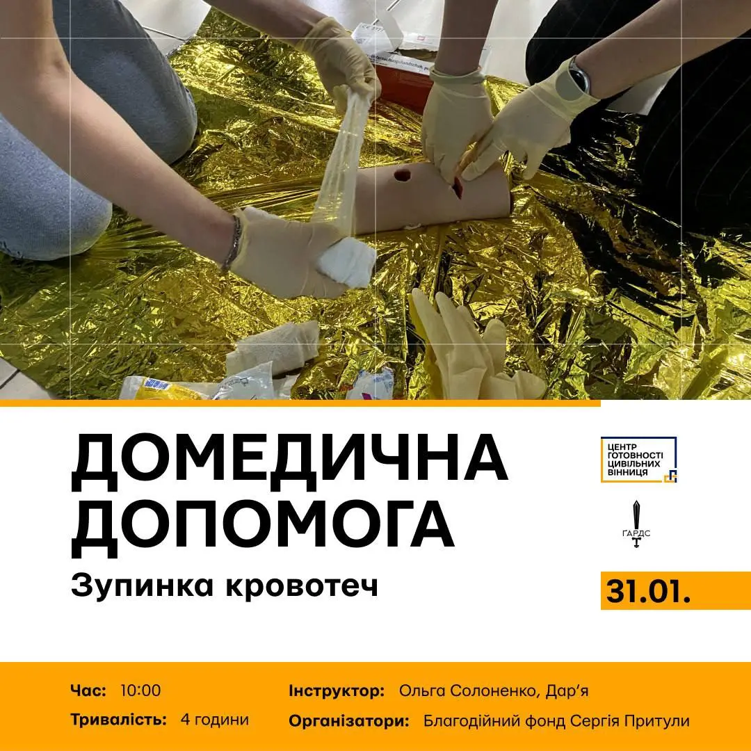 У Вінниці в суботу, 31 січня, проведуть навчання з домедичної допомоги, присвячене зупиненню кровотеч. Захід спрямований на формування практичних навичок дій у критичних ситуаціях, які можуть врятувати життя.