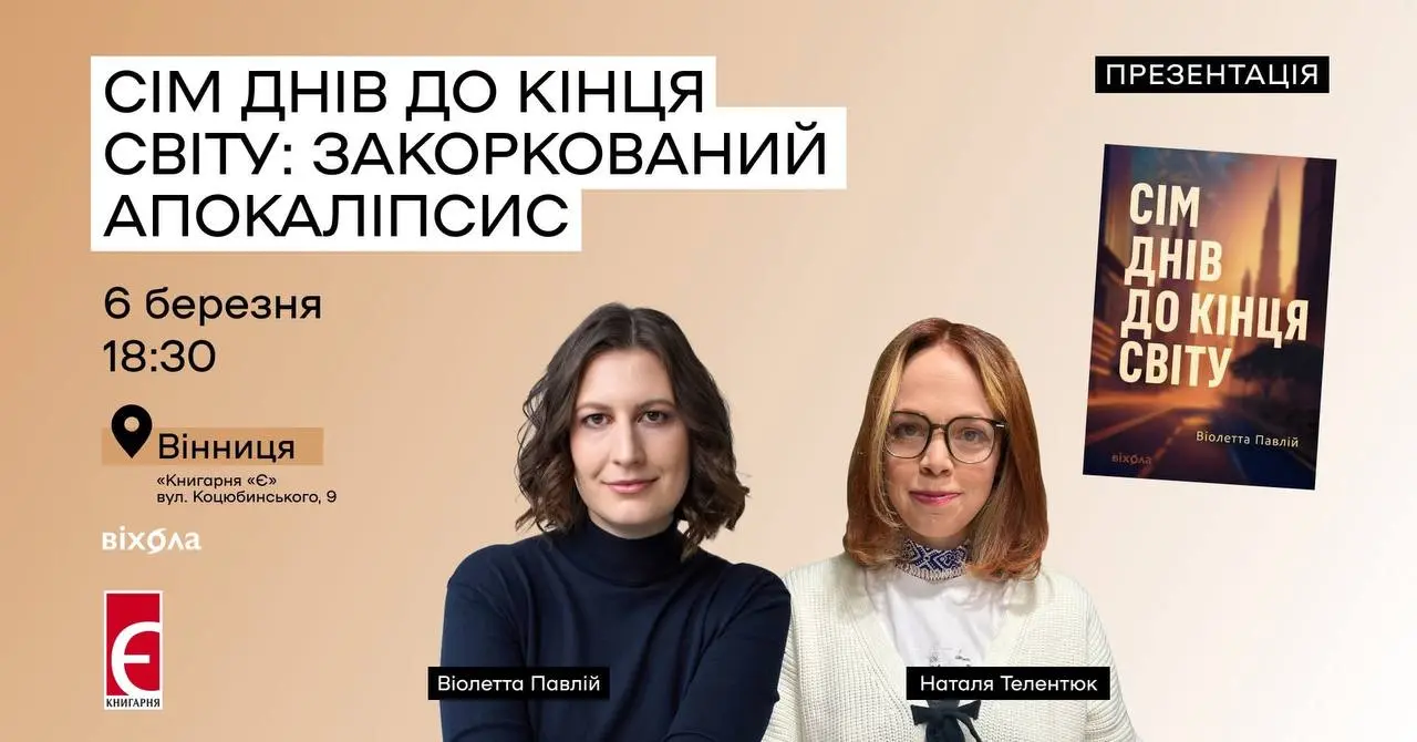 У «Книгарні Є» відбудеться зустріч з українською письменницею Віолеттою Павлій, де бажаючі зможуть поспілкуватися про роман авторки «Сім днів до кінця світу».
