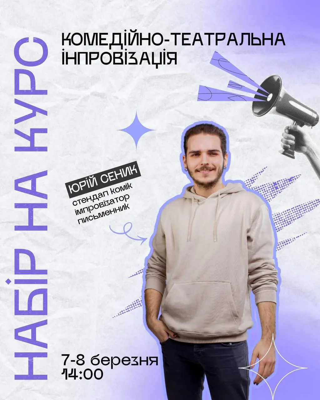 Курс проводить Юрій Сеник – стендап-комік, імпровізатор і письменник.