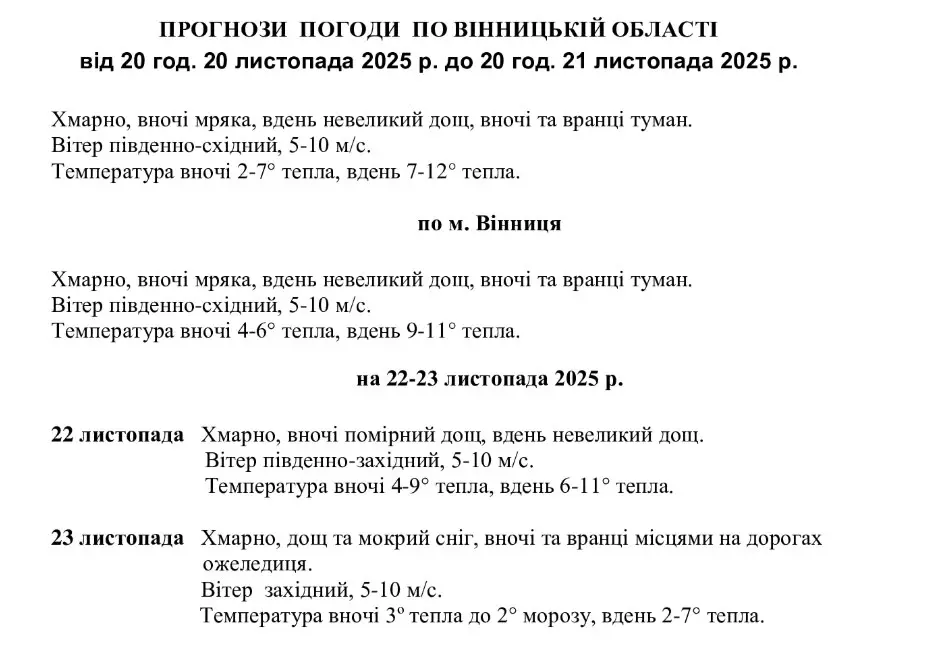 Про це повідомляє “Вежа” з посиланням на допис Вінницького обласного центру з гідрометеорології.