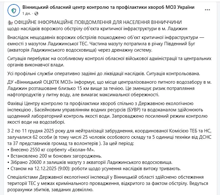 Наразі, за повідомленням ДУ «Вінницький ОЦКПХ МОЗ» від 12 грудня, відомо, що внаслідок атаки було пошкоджено обʼєкт критичної інфраструктури ТЕС, а саме – ємності з мазутом Ладижинської ТЕС. Частина мазуту потрапила в річку Південний Буг (акваторія Ладижинського водосховища) через дренажну систему.