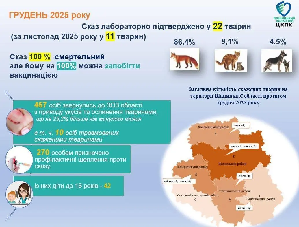 Усього за 2025 рік за антирабічною допомогою через укуси та ослинення тваринами звернулися 4 782 особи, з них 223 людини постраждали від скажених тварин. Найбільше звернень зареєстрували у Вінницькому районі – 2 394, Гайсинському – 733, Хмільницькому – 499, Тульчинському – 482, Жмеринському – 446 та Могилів-Подільському – 228.