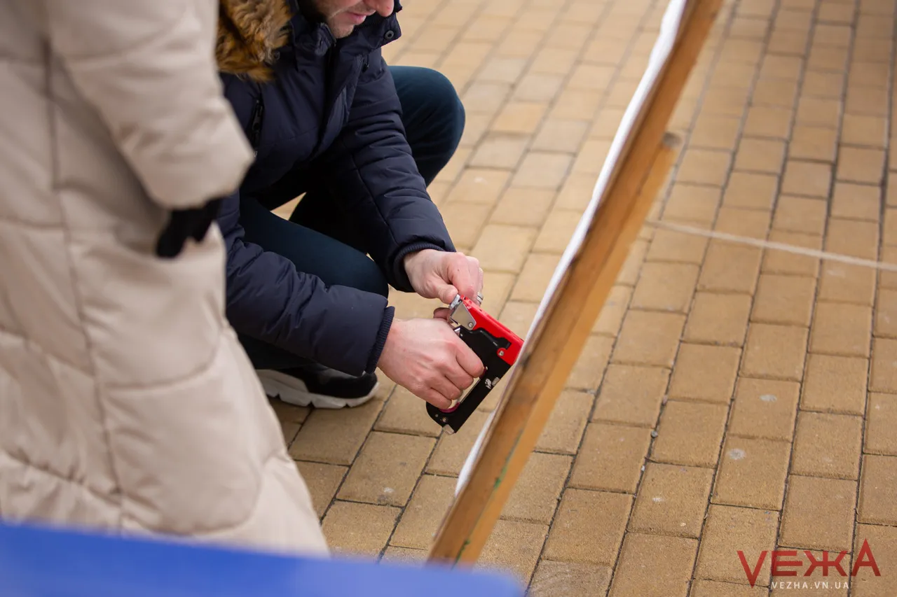 Попри вітряну погоду організаторам вдалося встановити дерев’яний каркас з білим одинадцятиметровим полотном, а також дві невеликі ємності з жовтою та блакитною фарбами поруч. Також організатори надавали гумові рукавиці, аби занурювати руки до фарб та не бруднитися.