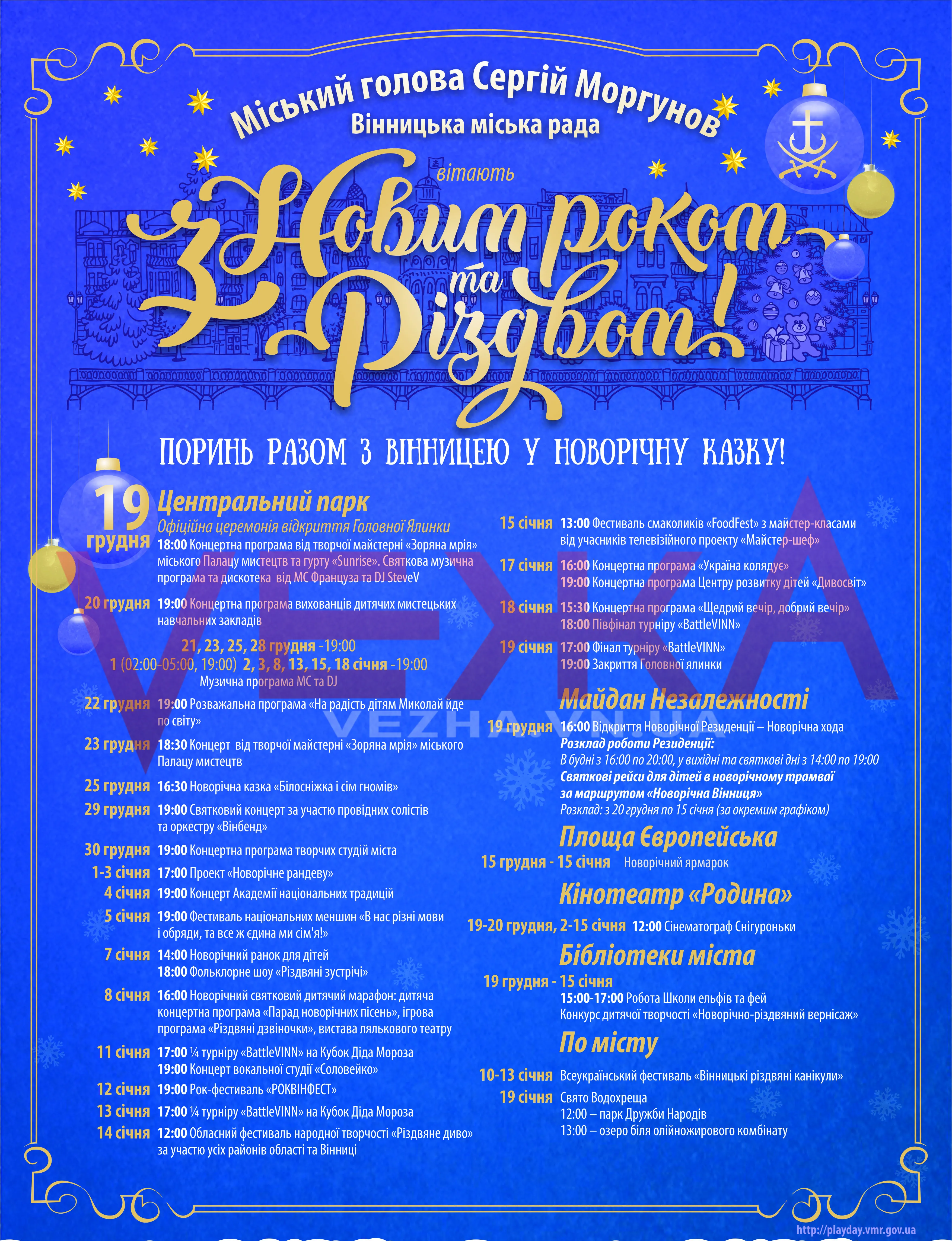 Протягом місяця – з 19 грудня по 19 січня – у Вінниці триватимуть святкові новорічні та різдвяні заходи. За цей час на трьох головних площах міста відбудуться новорічні ярмарки, фестиваль вуличної кухні, концерти вінницьких рок-гуртів та фестиваль колядок і щедрівок. Організовуючи святкову програму, міська рада та департамент культури подбали, щоб у святкові дні не нудьгував ніхто.