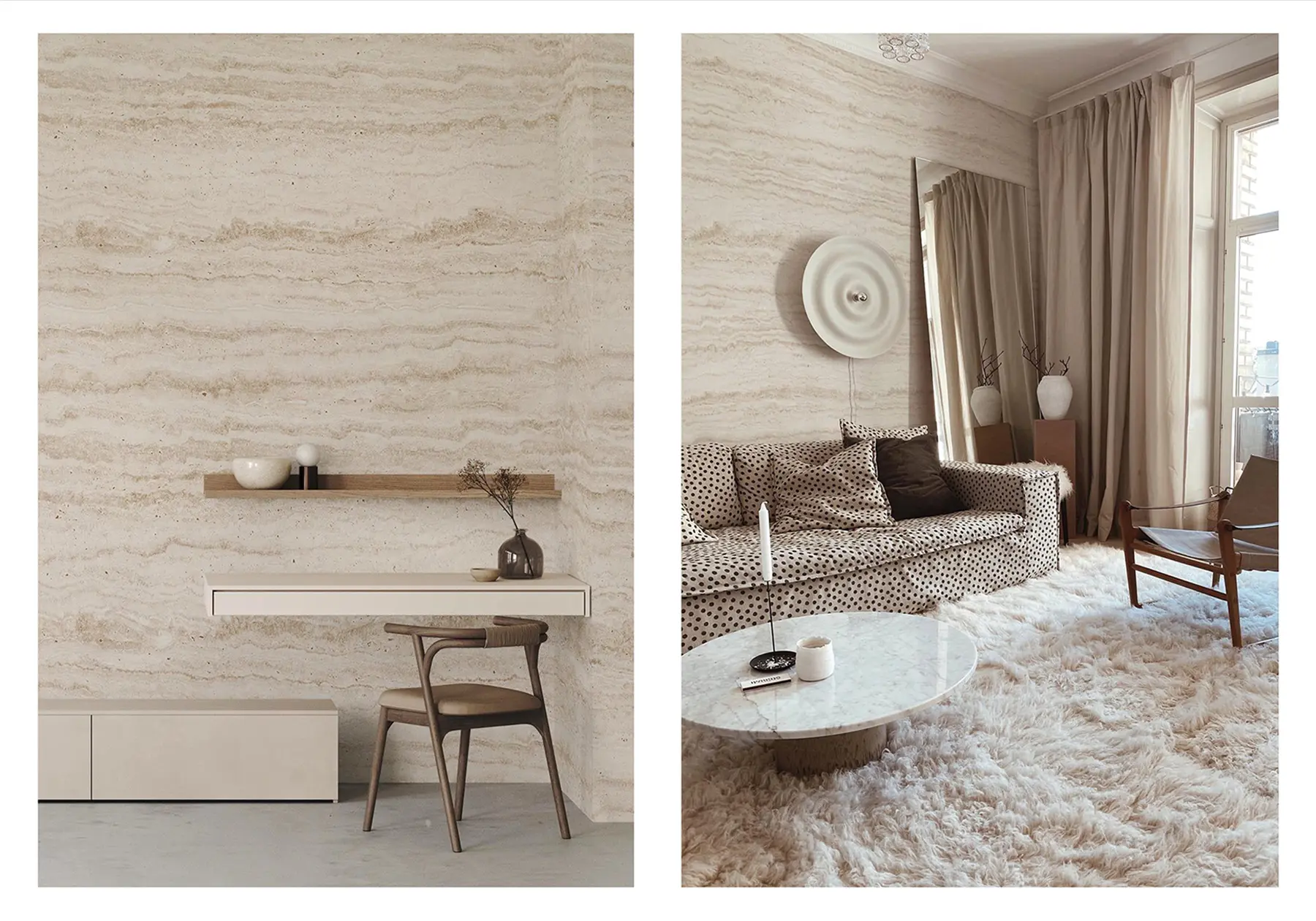 Еластичні характеристики матеріалу Travertino дозволяють відтворити будь-який кам’яний рельєф пісковика травертину або створити ефект Гротто (карта світу). В тренді натуральні природні кольори.