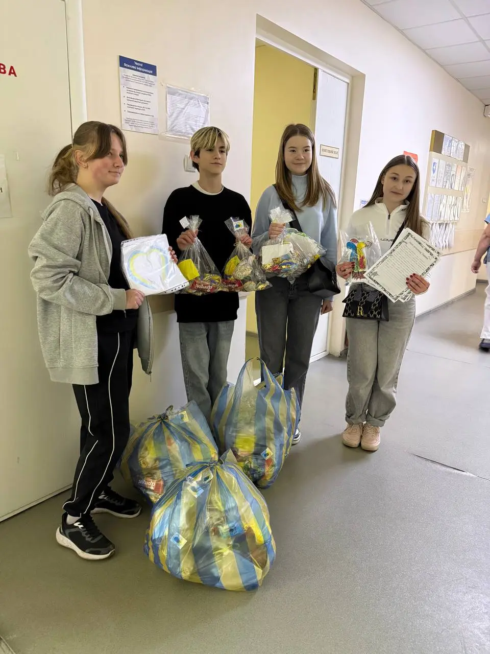 Пакунки передали захисникам, які лікують бойові травми та проходять реабілітацію після поранень. Школярі самі купували потрібне та пакували, а потім везли гостинці до медзакладів і заносили їх у палати.