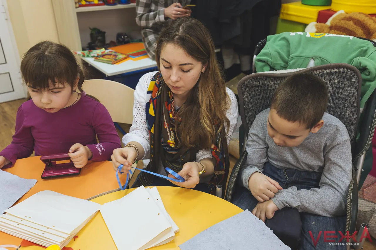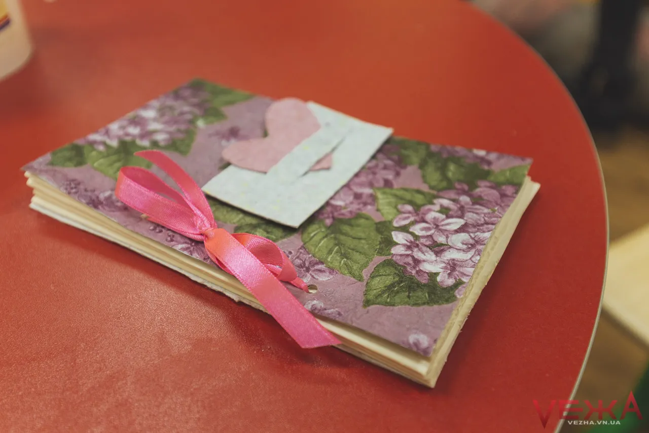 Потрапили ми вже на заключний етап створення — зшиття листочків та оформлення обкладинки. Яна Чайковська проводить майстер-класи для дітей з ДЦП та аутизмом, адже для них дуже корисна діяльність пов‘язана із дрібною моторикою рук. Минулого разу із непотрібного паперу, який був в центрі Гармонія дітки зробили тисячі дрібних папірців. За словами Яни, то була улюблена робота дітей в процесі створення блокноту чи листівки.