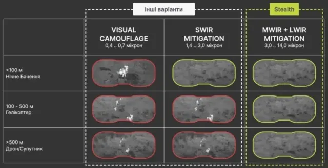– Мультиспектральне маскування: ефективність у ближньому, середньому та дальньому ІЧ-діапазонах.