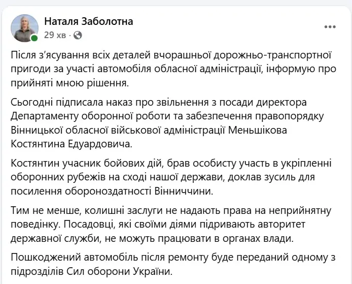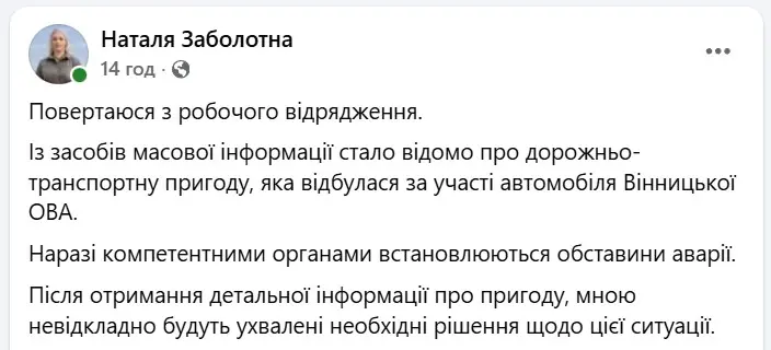 Наразі Наталя Заболотна написала, що “після зʼясування всіх деталей вчорашньої дорожньо-транспортної пригоди за участі автомобіля обласної адміністрації” прийняла рішення: