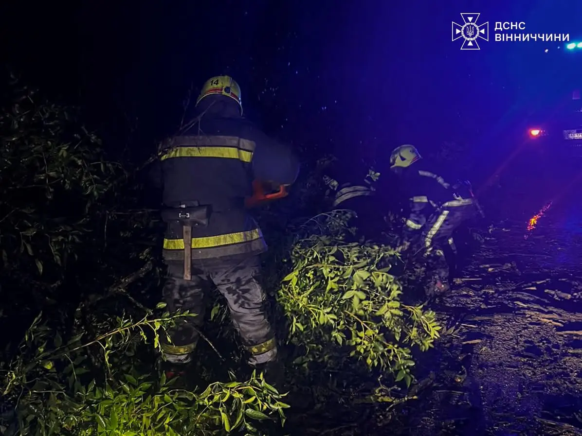 Так, через пориви вітру та рясний дощ «надзвичайники» розкряжовували стовбури повалених дерев у Тульчинській, Іллінецькій громадах та у Вінниці.