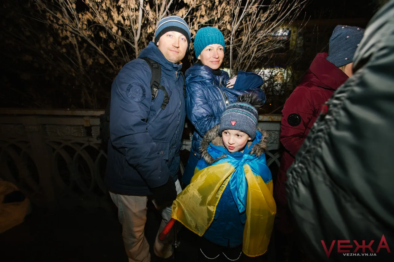 Чи не єдиними, хто прийшов “за покликом серця” стали Юрій та Олена Фільченко з двома маленькими синами. З собою вони навіть принесли прапор України. Кажуть, що участь в у створенні “Ланцюга Єдності” беруть вже три роки поспіль, відколи переїхали до Вінниці з Маріуполя, і що завжди намагаються підтримувати будь-які патріотичні акції.