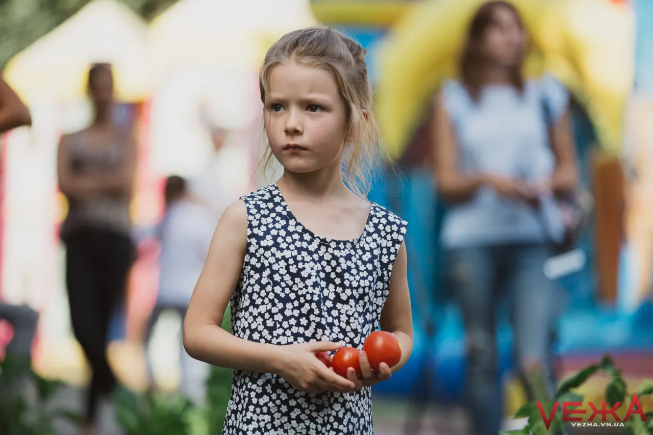 Сьогодні ж близько 20 дівчаток та хлопчиків більше розважалися, аніж працювали. Перше та головне завдання – знайти єдині на всьому городі кавун та диню. Діти логічно шукали все у овочах, та потім ведуча порадила пошукати й у квітах. Відтак, із цією справою швидко впорались дівчатка, а інші овочі більше приносили дорослим – хлопчики.