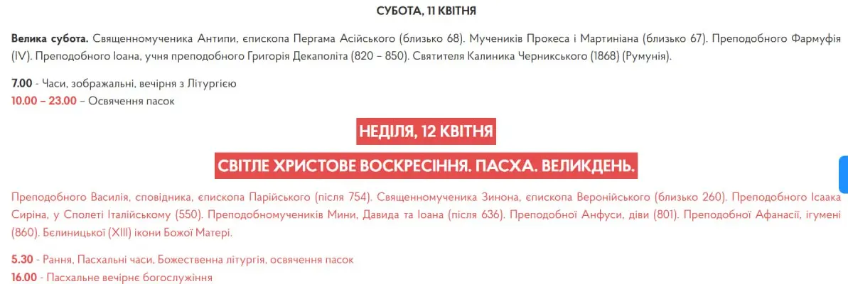 Завтра, 12 квітня, о 5:30 розпочинається Божественна літургія та освячення пасок. А о 16:00 – Пасхальне вечірнє богослужіння.