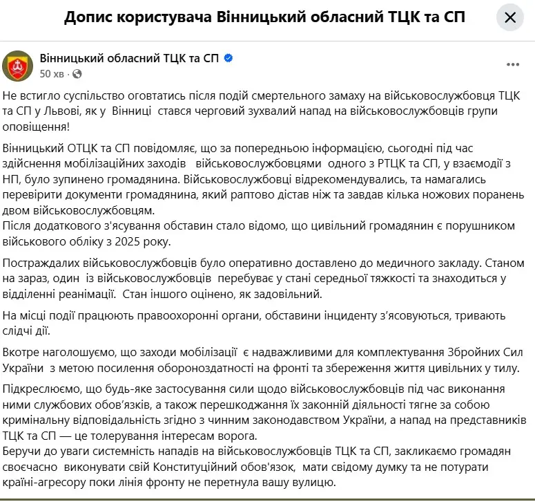 – Військовослужбовці відрекомендувались та намагались перевірити документи громадянина, який раптово дістав ніж та завдав кілька ножових поранень двом військовослужбовцям, – зазначено у дописі.