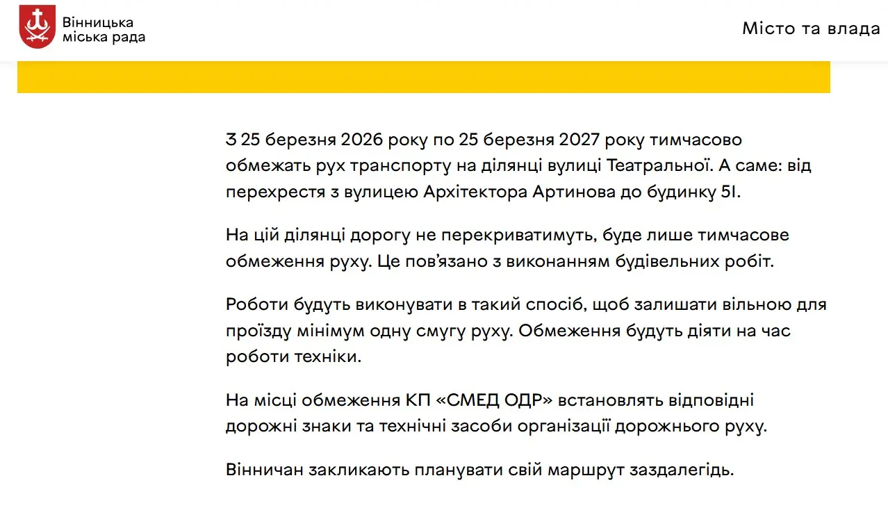 У Вінниці з 25 березня 2026 року по 25 березня 2027 року обмежать рух транспорту на ділянці по вулиці Театральній.