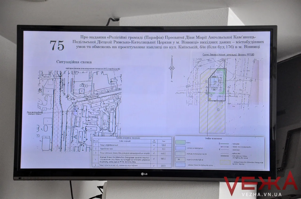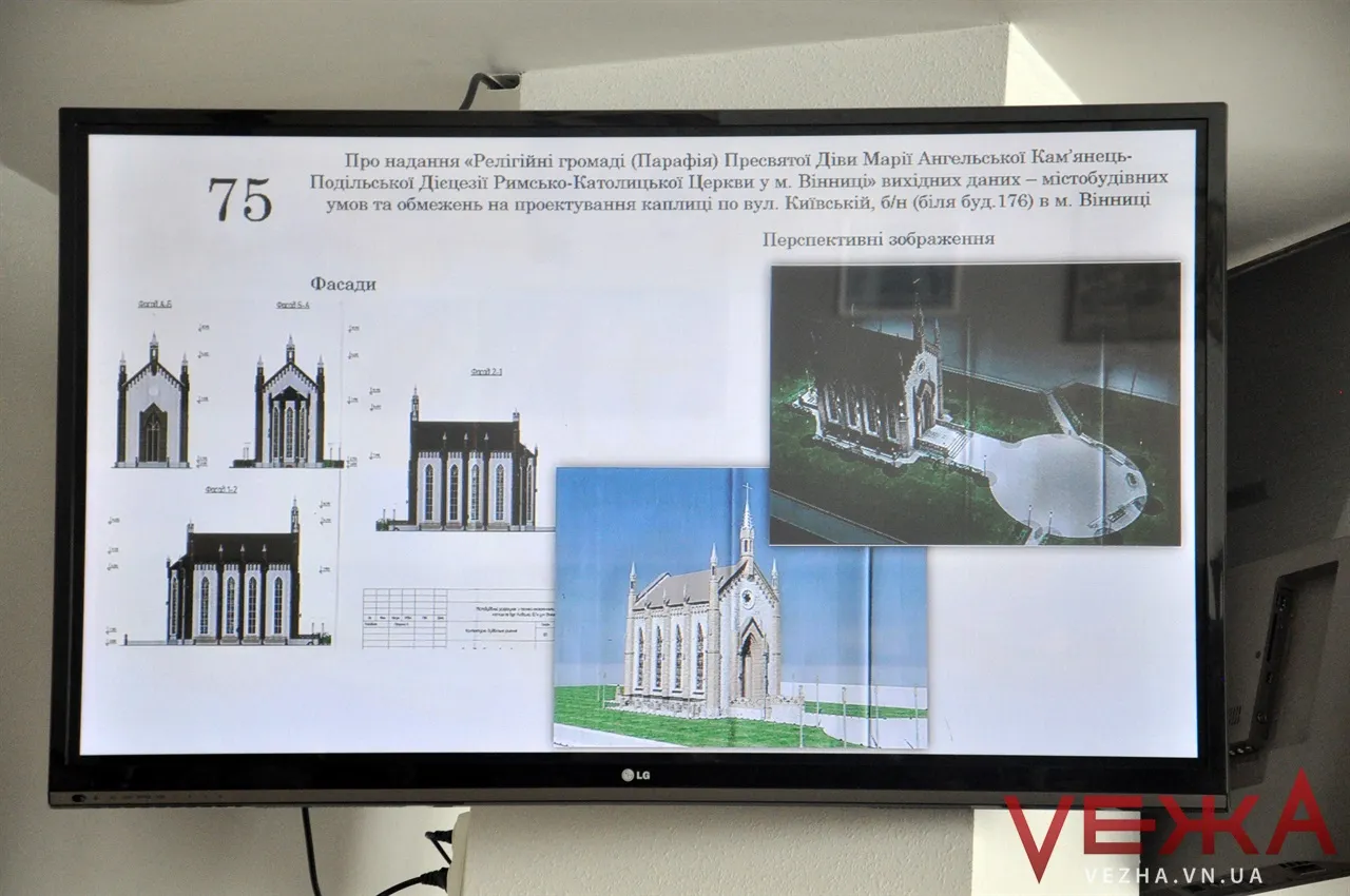 Зокрема йдеться про надання “Релігійній громаді (Парафія) Пресвятої Діви Марії Ангельської Кам’янець-Подільської Дієцезії Римсько-Католицької Церкви у місті Вінниці” вихідних даних – містобудівних умов та обмежень на проектування каплиці по вулиці Київській, біля будинку №176.