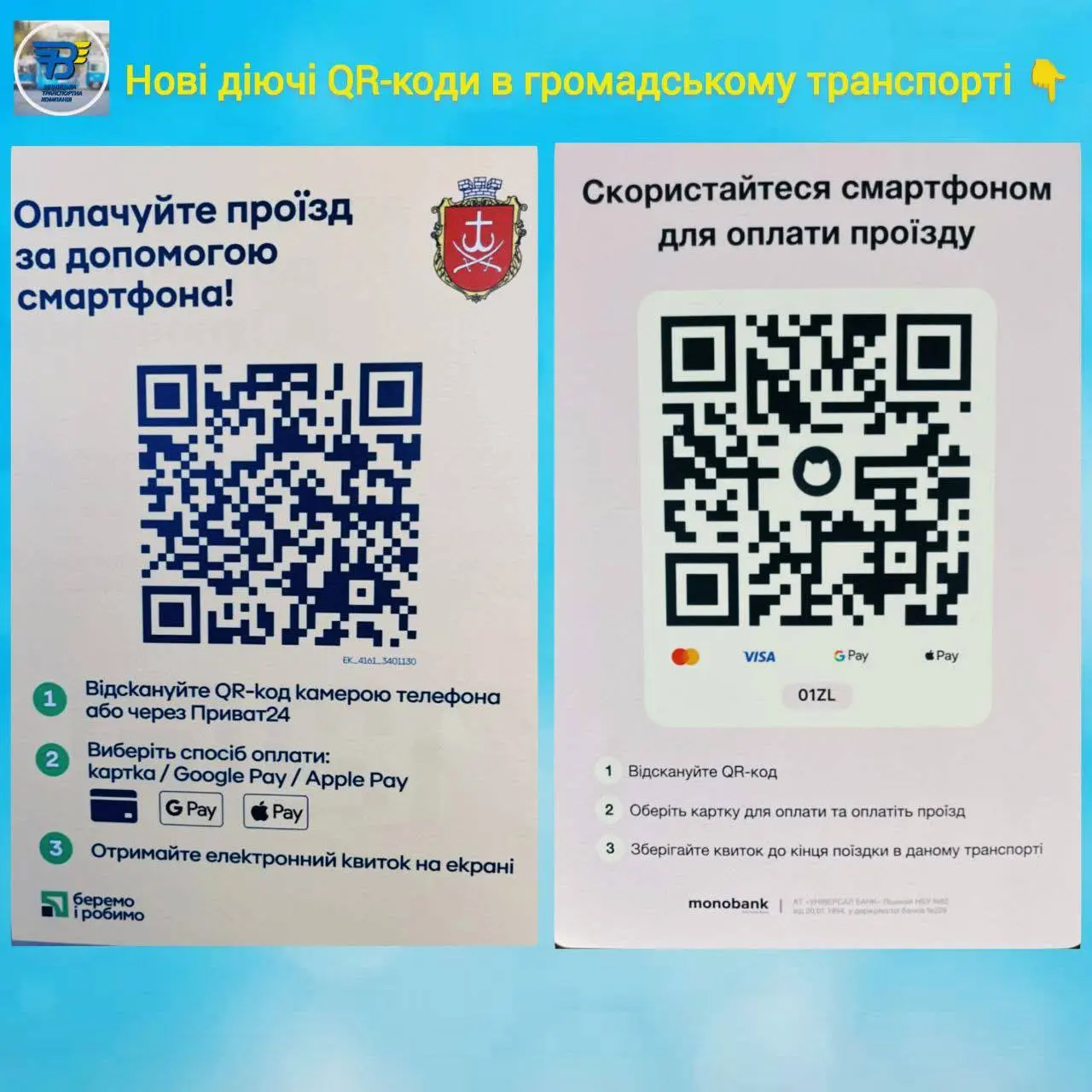У салонах транспорту розміщують два типи QR-кодів: жовті – від ПриватБанку та рожеві – від monobank. Пасажири можуть скористатися як мобільними застосунками банків, так і камерою смартфона.