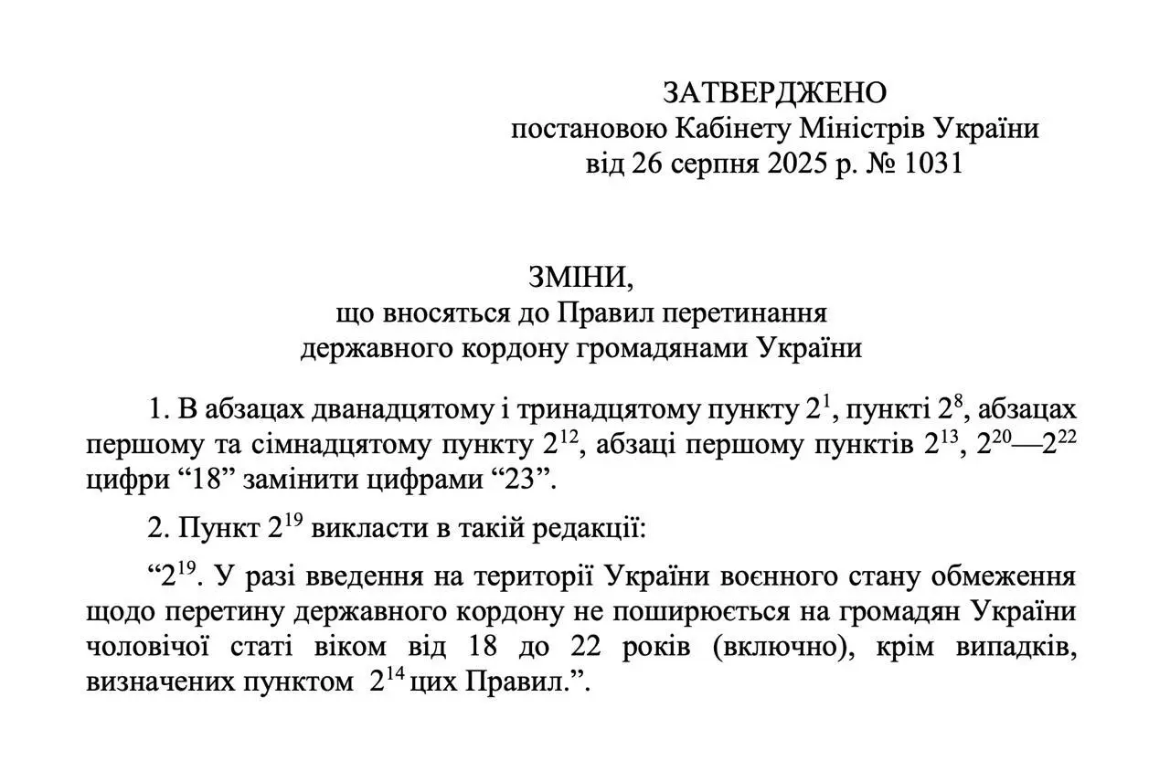 Сьогодні, 27 серпня, Кабмін опублікував постанову про внесення змін до правил перетинання державного кордону, де йдеться про вік від 18 до 22 років включно: