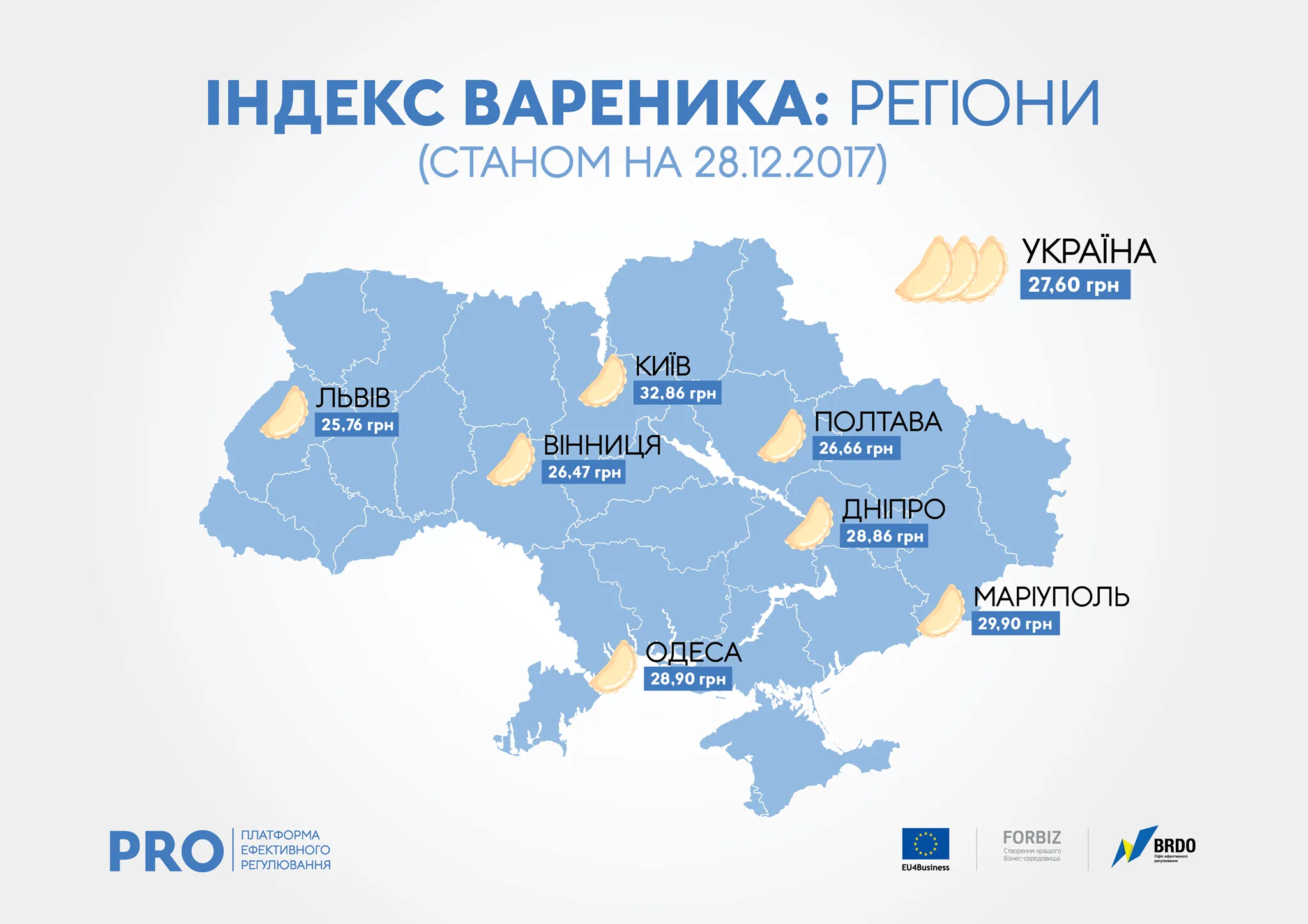 За останніми розрахунками, найдорожче складові «вареника» продають у Києві (майже 33 гривні), Одесі (майже 30 гривень) та Маріуполі (29,90), найдешевше – у Львові (25,76 грн.).