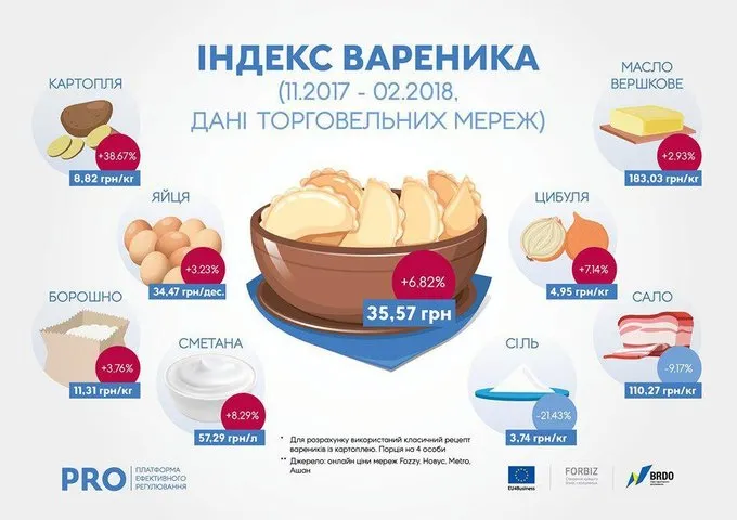 Сервіс містить щоденну динаміку цін на товари за даними найбільших онлайн-супермаркетів. Інформація представлена і в регіональному розрізі. За словами голови BRDO Олексія Гончарука, ціни за індексом вареника за останні 4 місяці виросли на 6,82%.