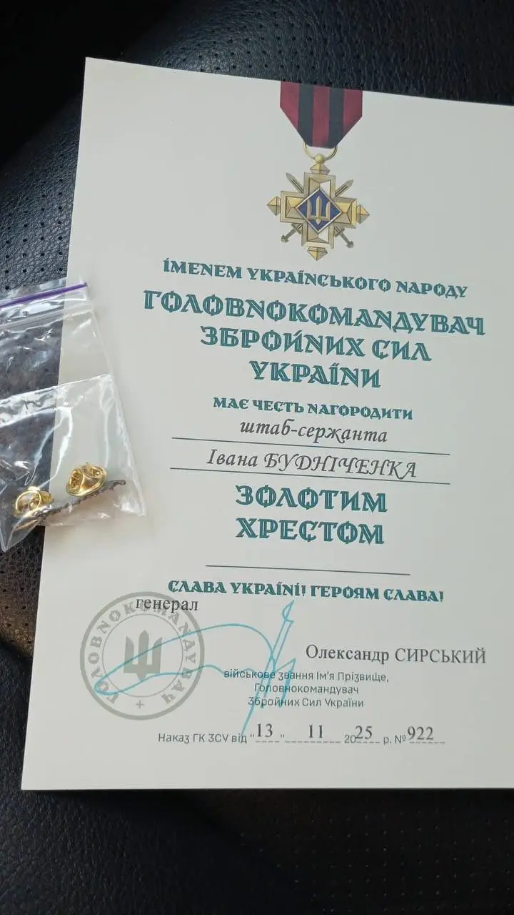 Штаб-сержанта Івана Будніченка з Вінниччини відзначено почесним нагрудним знаком «Золотий хрест» від Головнокомандувача ЗСУ Олександра Сирського.