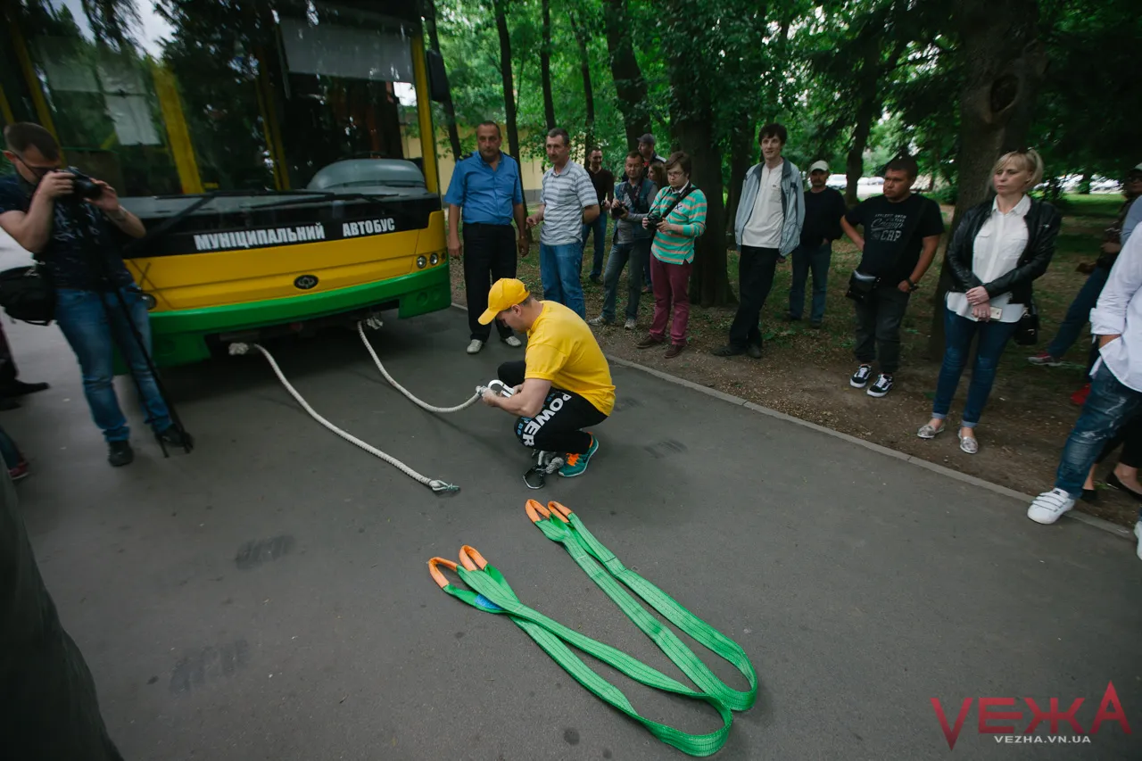У муніципальному автобусі 30 посадкових місць зайняли школярі і таким чином встановили вагу у 14 тонн. Переважна більшість вінничан запитувала одне одного хто буде тягнути автобус і чи це хтось із відомих спортсменів. Старт глядачі зустріли гучними оплесками та вигуками підтримки.