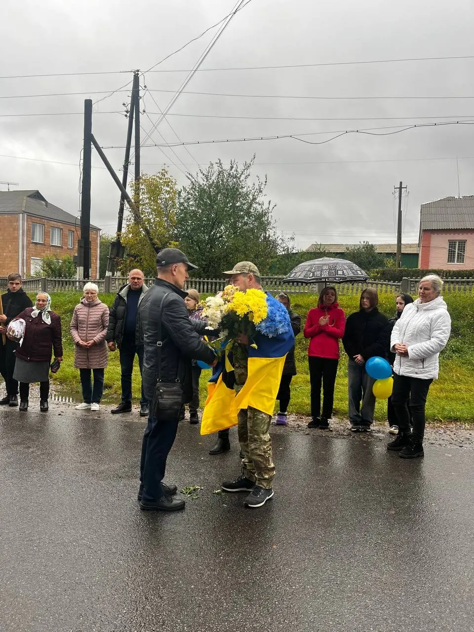 Його зустрічали з квітами, короваєм та прапором – усе в блакитно-жовтих кольорах.