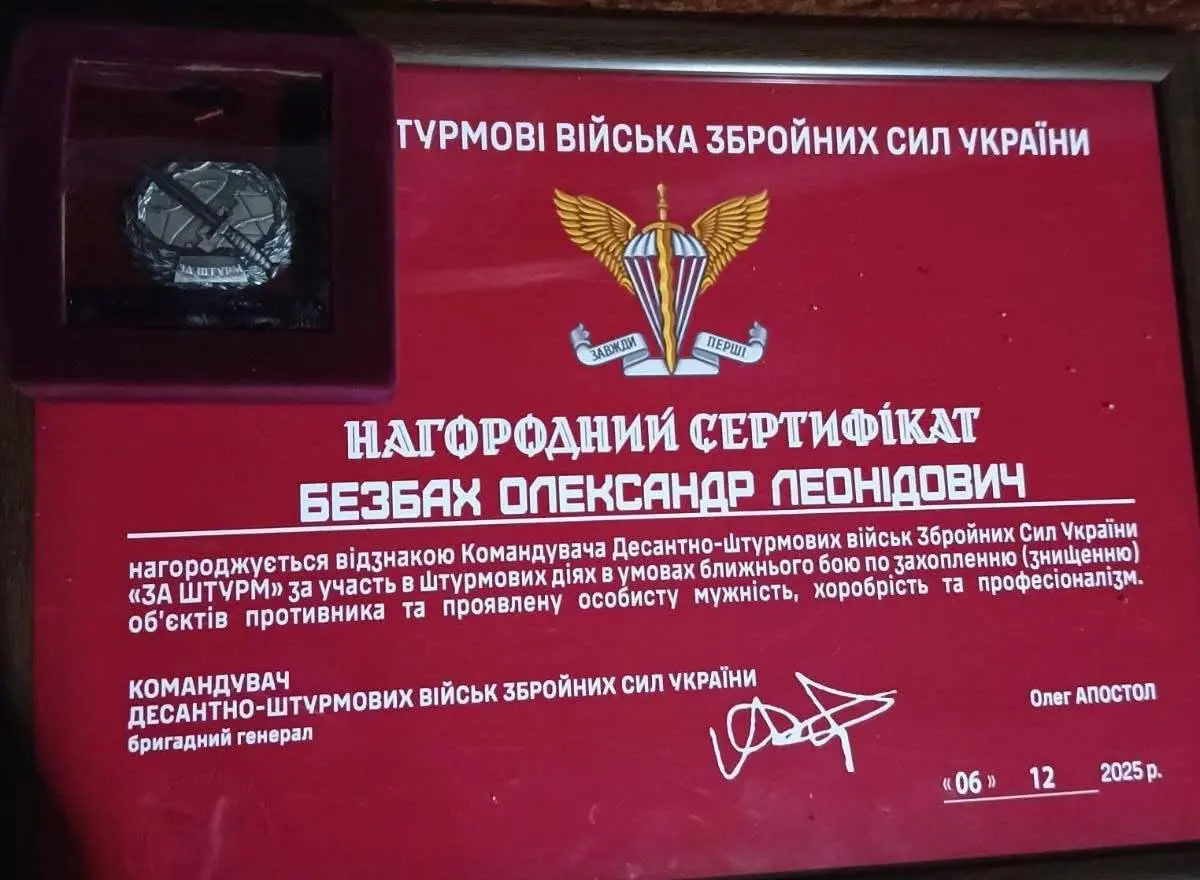 Військовий із Тульчинської громади Олександр Безбах отримав відзнаку Командувача Десантно-штурмових військ Збройних Сил України «За штурм».